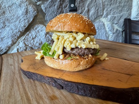 Salat, würzige Röstzwiebeln, knuspriger Bacon, Käse-Makkaroni und hausgemachte Burgersoße